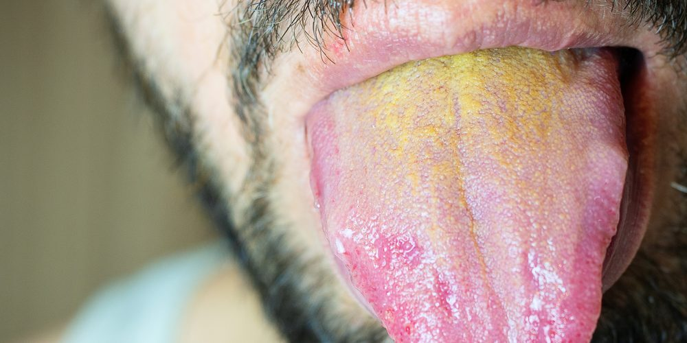 قد تظهر عند الإصابة بأمراض معدية، أو مشكلات في الجهاز الهضمي، أو الصيام لفترات طويلة، أو الجفاف. كما يشير هذا اللون إلى اضطرابات جهازية ويتطلب تقييمًا للحالة العامة وليس مجرد علاج موضعي.