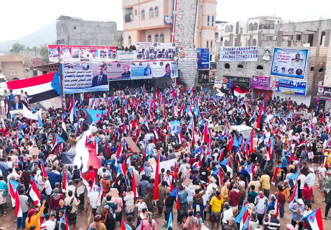 وفي فعالية جماهيرية حاشدة، أكد المتظاهرون في منصّة "الشهداء" بمديرية ردفان، غربي محافظة لحج، تجديد التفويض الشعبي الكامل لرئيس المجلس الانتقالي الجنوبي، عيدروس الزبيدي، والرفض المطلق للإعلان المزعوم بحلّ المجلس، باعتباره "باطلا وغير شرعي" وفق تعبيرهم.